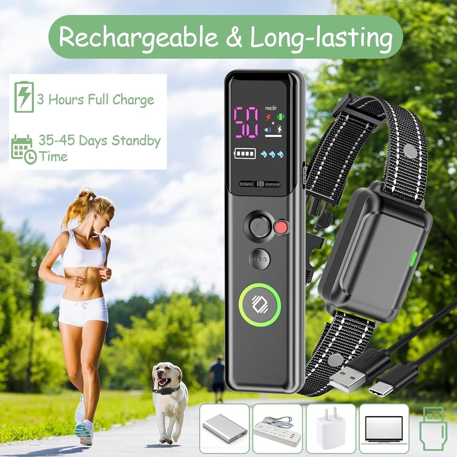 USB charging design, simple and convenient. This e-collar has a long battery life and can be fully charged in just 2-3 hours. Standby time is up to 35 days for the smart dog collar and 45 days for the remote control!